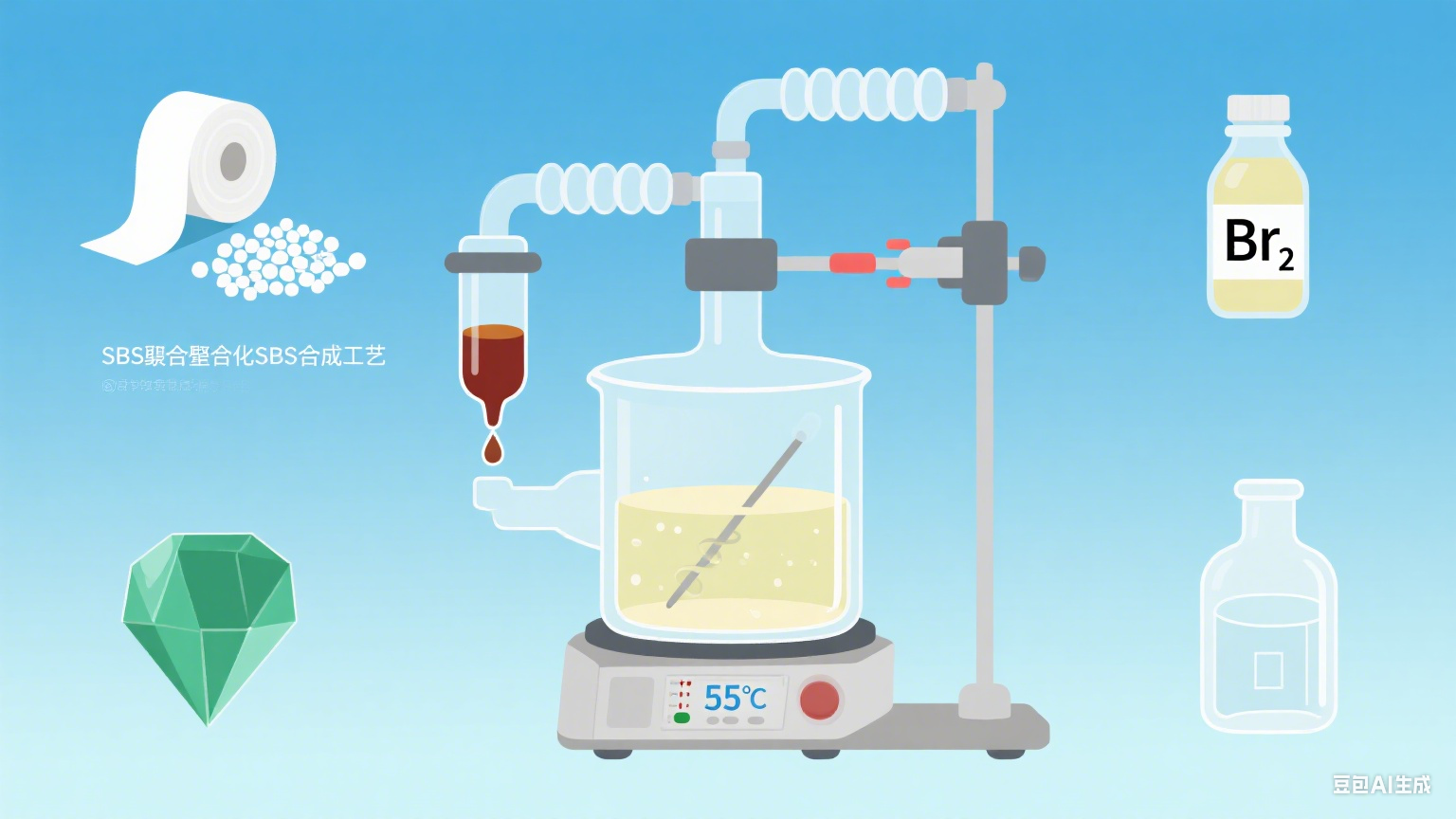 在溶液中加入適量的溴素(Br?),開(kāi)始溴化反應。該反應通常在一定溫度下進(jìn)行,常見(jiàn)的反應溫度為40-70°C。在反應過(guò)程中,溴分子與SBS中的不飽和雙鍵發(fā)生加成反應,生成溴化SBS。