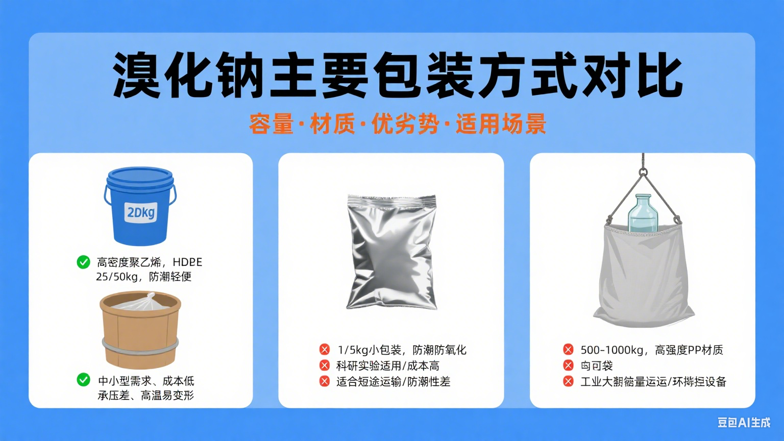 溴化鈉(NaBr)作為一種廣泛應用于化工、醫藥、染料等領(lǐng)域的化學(xué)產(chǎn)品,其包裝方式至關(guān)重要,直接影響到其運輸、儲存以及使用的便利性。本文將詳細介紹溴化鈉廠(chǎng)家的主要包裝方式。